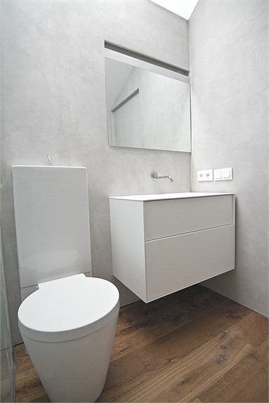 Po drugiej stronie przeszklona, minimalistyczna witryna z kolekcją porcelany.
